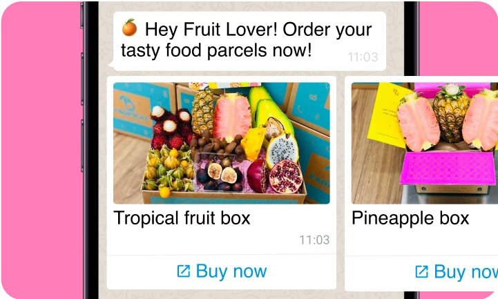 Send scrollable cards with images, videos, descriptions, and buttons to build a rich, interactive shopping experience inside WhatsApp.
